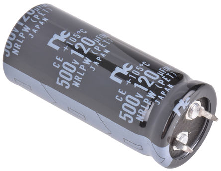 NIC Components NRL-PW 系列 500 V 直流 120μF 通孔 铝电解电容器 NRLPW121M500V22X50SF, ±20%容差, 3.454Ω(等值串联), 最高+105°C