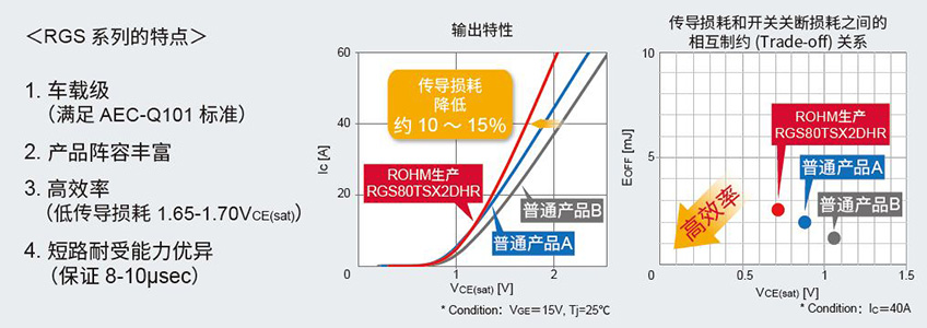 在这类背景图下,ROHM开发设计出考虑汽车电子产品可信性规范AEC-Q101的1500V击穿电压商品,与700V击穿电压商品相互组成了丰富多彩的商品陣容。RGS系列产品保持了业内领跑的低传输耗损(Vce(sat.)),十分有利于运用的实用化和高效性。除此之外,1500V击穿电压商品的短路故障耐受性※5)時间为10μsec(Tj=20℃),即便在规定销售电价的车截行业也可放心买。